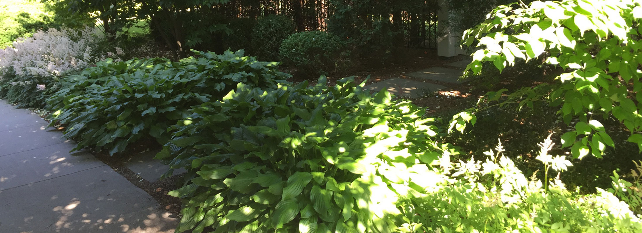 A serene, shaded garden lines the walkway, featuring lush hostas with their broad, textured leaves and feathery astilbe in soft, pastel hues. This tranquil combination creates a calming, low-maintenance space that thrives in the dappled light, inviting quiet moments of reflection.